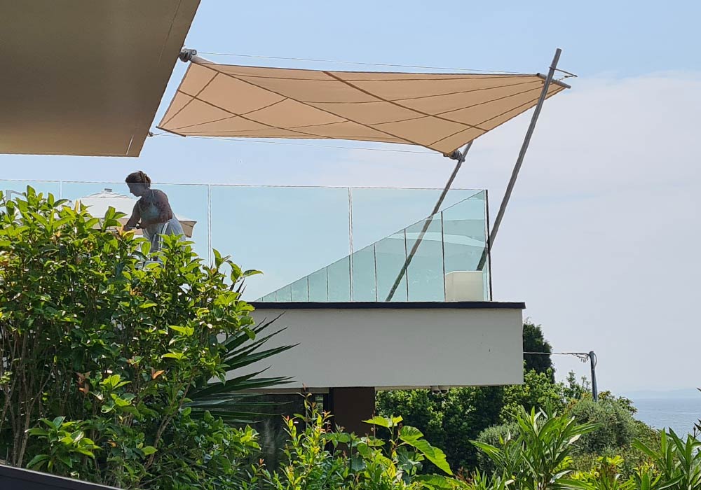 Unser Design der Pfosten und Halterungen ist schlank, unauffällig und dynamisch. Das Segel wird nur an einem Seil gespannt.